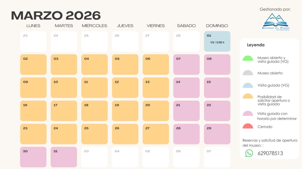 Los días que se indica en el calendario puedes solicitar la apertura del museo en horario de mañana (de 10:00 h a 13:30 h) para un mínimo de 4 personas mayores de 14 años (en caso de ser menos se puede solicitar abonando el equivalente a 4 personas mayores de 14 años).